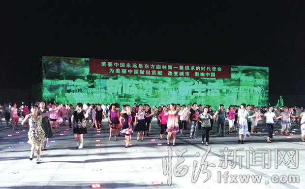 图为市民在尧都公园广场跳健身舞