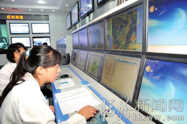 图为市气象台的工作人员在观测云层走势情况。记者 魏华 摄