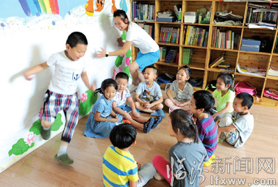 7月23日,在我市童蒙养正儿童之家,老师在和孩子做游戏。该校立足孩子自然成长规律,以传统国学和蒙式教学相结合,注重孩子的心理健康,培养他们健康、快乐的心态,掌握科学的学习方法。