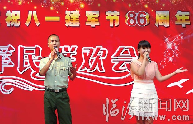 七月二十八日, 在武警临汾市支队三中队营地, 武警战士和慰问的演出人员合唱歌曲《为了谁》。 当日一支由退伍军人企业家组成的文艺慰问团队走进三中队和这里的战士联欢互动以歌舞小品快板等形式共同庆祝建军节的到来。