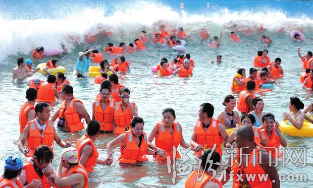 8月15日,市民在临汾市区华尧水上乐园体验“海啸”来袭。当日我市的最高气温达到37摄氏度,市民们纷纷走进游泳馆、水上乐园戏水纳凉,躲避“秋老虎”。