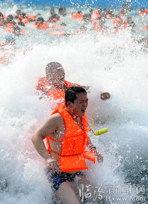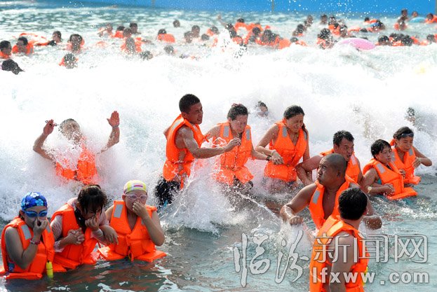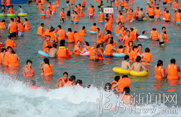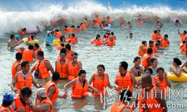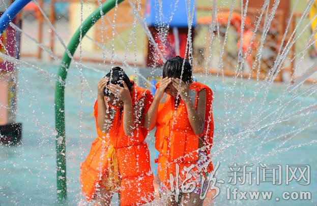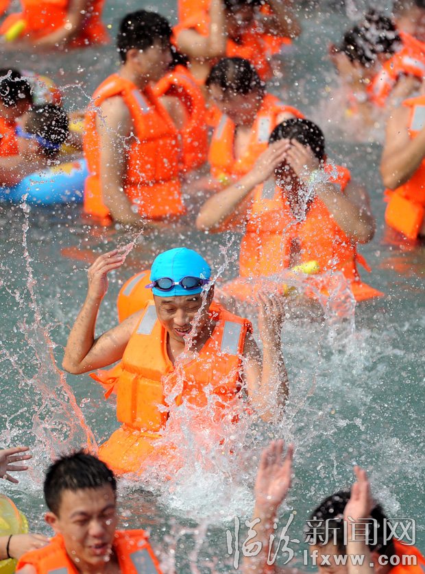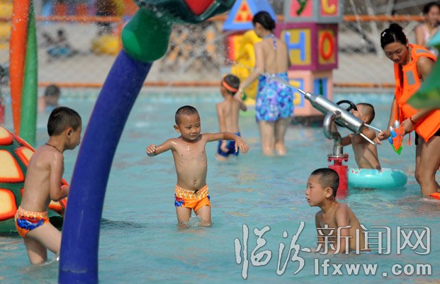 8月15日,市民在临汾市区华尧水上乐园戏水消暑。当日山西省临汾市的最高气温高达37摄氏度,市民们纷纷走进游泳馆、水上乐园戏水纳凉,躲避“秋老虎”。 闫锐鹏 摄