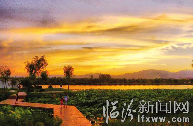 8月23日,美丽的汾河公园在晚霞的衬托下分外妖娆,优美的生态景观让前来游玩的市民叹为观止。 记者 苏亚兵 摄