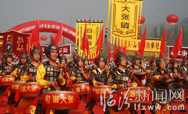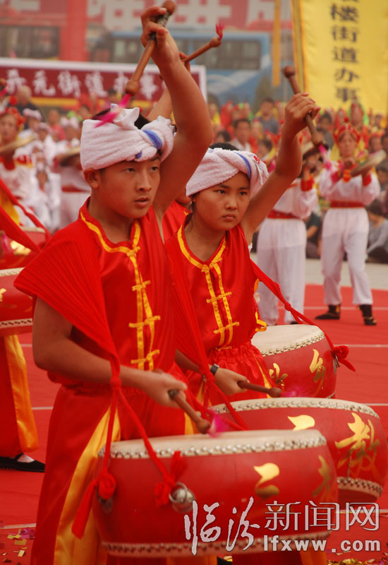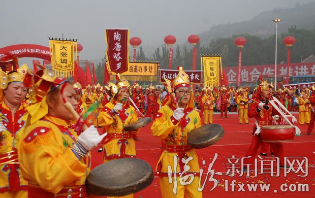 8月26日,在霍州市七里峪镇山广场,该市13支锣鼓队进行表演。当日,“中镇霍山 华夏州署”第八届文化旅游月开幕。此次旅游月活动,以“盛世中国梦 臻美新霍州”为主题,全方位、多角度展示霍州市七里峪、霍州署衙、陶唐峪等优美风光、文化魅力。(记者 李自强 摄)