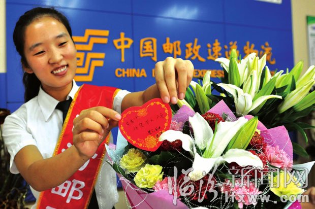 “李老师,祝您节日快乐!”9月9日下午,市邮政局邮政礼仪门市部接到了来自全市各个学校学生的订花请求,工作人员一边收拾眼前的鲜花,一边给一位老师拨打电话,代表客户送上祝福。