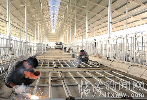 翼城县富华奶牛养殖公司二期工程总投资2000万元,是集养殖、饲草、肥料、沼气一体化的农业循环经济项目,目前,6000平方米厂房主体、1万立方米污粪处理池和5千立方米青贮池已完工,9月下旬投入使用后可新增存栏奶牛1000头。图为工人正在翼城县富华奶牛养殖公司二期工程工地紧张施工。 李茁壮 摄