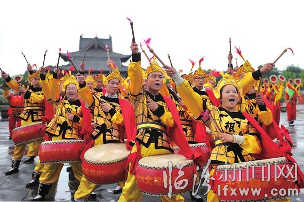八月三十日在洪洞县大槐树寻根祭祖园由园区工作人员组成的威风锣鼓队在为游客表演。 大槐树寻根祭祖园在加大景区文化建设的同时, 组建了威风锣鼓队, 在为游客表演的同时, 把临汾的锣鼓文化更好地传播出去。 记者 闫锐鹏 摄