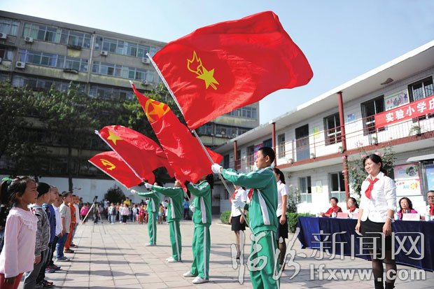 10月10日,尧都区实验小学的师生在进行传递“国旗、党旗、团旗、队旗”四面旗帜活动。当日,尧都区实验小学举行了“红领巾相约中国梦”庆祝中国少年先锋队建队64周年纪念活动,通过重温誓词、红色旗帜传递、追寻中国少年先锋队的革命光辉历程,接受爱国主义教育洗礼,激发全体少先队员树立远大理想、健康快乐成长。