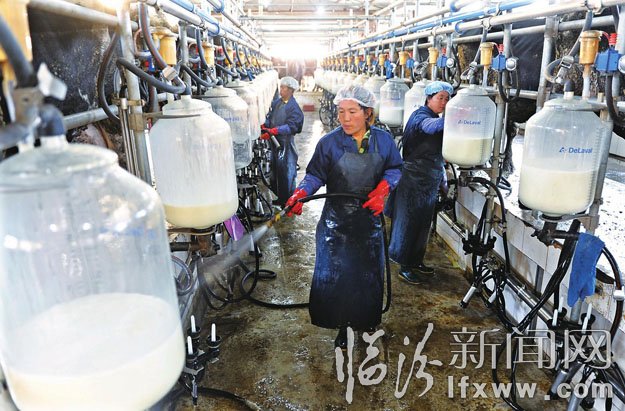 10月11日,在我市“巾帼创业基地”——尧都区傲康养殖发展有限公司,工作人员正在现代化的生产车间收集牛奶。