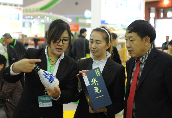 华尧酒的工作人员在向客商推介酒的特点