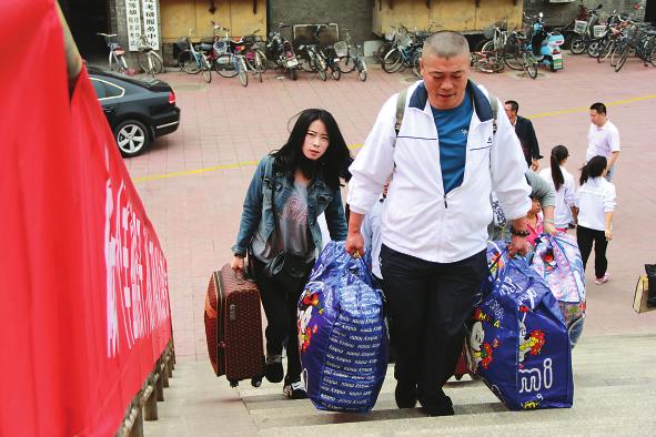 家长大包小包送孩子入学