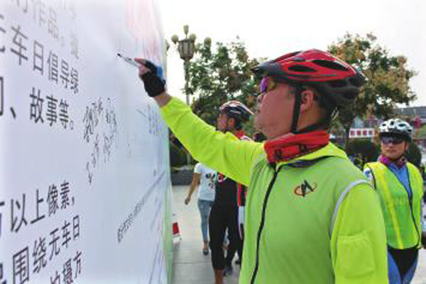 9月22日,爱好骑行的市民在参加我市大型骑行公益活动。当日是世界无车日,由市公益文化传播协会和美利达自行车俱乐部联合主办了大型骑行公益活动,旨在让市民自发参与骑行活动,宣传绿色出行理念,号召更多市民加入低碳出行的队伍,以实际行动参与到环境保护的行列之中。 记者闫锐鹏 孙国芳 实习生 樊子锐
