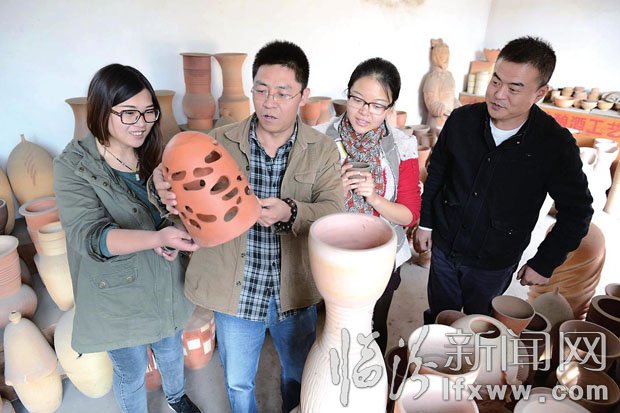 11月4日,在我市红陶坊陶艺工作室,制陶大师段禹光(左二)在和山西师范大学美术学院的老师交流制陶工艺。该工作室立足红陶研究和创新,在传统制陶工艺中融入现代元素,制作出来的红陶艺术品以朴素、厚重的艺术风格,深受艺术市场的欢迎。 记者 闫锐鹏 摄