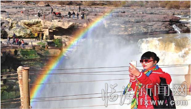 11月6日,一道美丽的彩虹从吉县壶口瀑布直插天际,形成壶口瀑布四大奇观之一的“彩桥通天”美景。秋冬季节,黄河水在上游水库的调控下,水势平稳,流量大小适中。吉县壶口瀑布的落差也随着十里龙槽水位的下降而加大。飞流直下的瀑布溅起大片白色的水雾。在阳光的照射下,一条巨大的彩虹飘忽其间,色彩绚丽夺目,让许多游客流连忘返。 吕桂明 摄