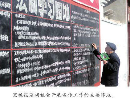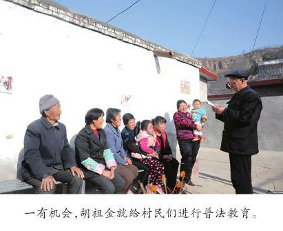 胡祖金,今年88岁,吉县司法局公证处原主任。1990年退休后,他放弃城里舒适优越的生活环境,谢绝儿女们的热情挽留,和老伴回到家乡屯里镇太度村居住。回到村里,他没有图轻闲、享清福,而是当起了村里的法律义务宣教员。多年来,他坚持以各种不同的方式宣传党在农村的路线、方针、政策,普及法律知识。此外,胡祖金还自愿担任了吉县屯里镇9所小学的校外辅导员,每学期都要巡回到各学校讲两次课,对少年儿童进行革命传统教育、法律知识教育、安全常识教育。