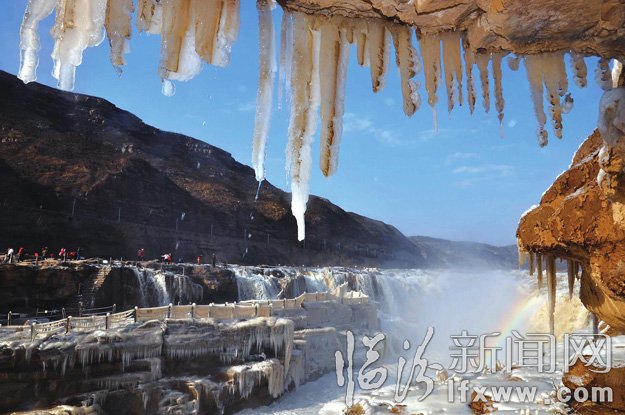 12月6日,游客在吉县黄河壶口瀑布景区欣赏拍摄冰挂景观。近日,受持续降温天气影响,黄河壶口瀑布出现流凌,飞溅的浪花在瀑布两岸形成冰挂,吸引了众多游人前往观赏。 吕桂明 摄