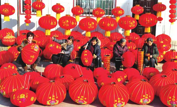 2014年12月31日,在洪洞县红红火火灯笼有限公司,工作人员在加班赶制客户定做的灯笼。随着新年的到来,该公司的订单多了起来,处处是红火喜庆的场景,迎接元旦的到来。