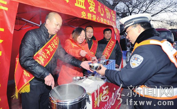 1月3日,在市区鼓楼广场,志愿者将热粥送到执勤交警的手中。 临汾阿牛公益爱心协会“公益爱心粥”自去年12月20日免费发放以来,为公安交警、环卫工人、爱心献血人士和普通市民免费提供热乎乎的粥,用爱心将“小善”汇集成“大爱”,让这个冬天不再寒冷。 本报记者闫锐鹏摄