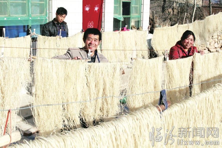浮山县东张乡、响水河镇等地有着上百年手工制作粉条的历史。近年来,该县深入挖掘传统工艺,引领村民成立粉条专业合作社,通过“企业+农户”模式带领群众致富奔小康。图为东张乡卫村村民张师彪和家人正在忙着整理晾晒粉条。