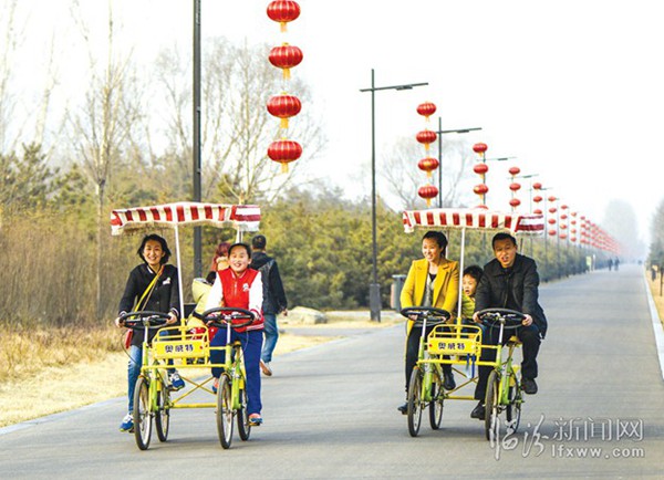 为了迎接农历羊年的到来,临汾汾河公园内挂起了象征着喜气年味的大红灯笼,以进一步营造浓厚的春节氛围。图为2月14日,在汾河景区内,市民正在骑观光车游玩。 记者 张蕴强 摄