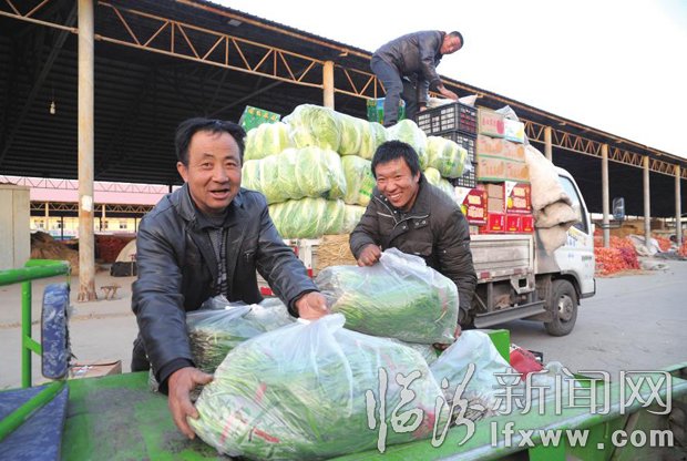 2月12日,在市区北城山西馨阳农产品批发市场,永和县菜农冯保平正在往货车上装蔬菜。春节临近,我市各大蔬菜批发市场货源充足,为节日市民的“菜篮子”提供了保障。