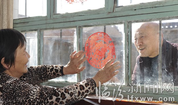 2月16日,在山西省临汾市浮山县佐村,天坛镇林业站长贾培章在和妻子李红梅在张贴廉政窗花。