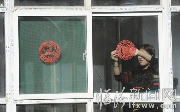2月16日,在山西省临汾市浮山县佐村,李红梅在张贴廉政窗花。