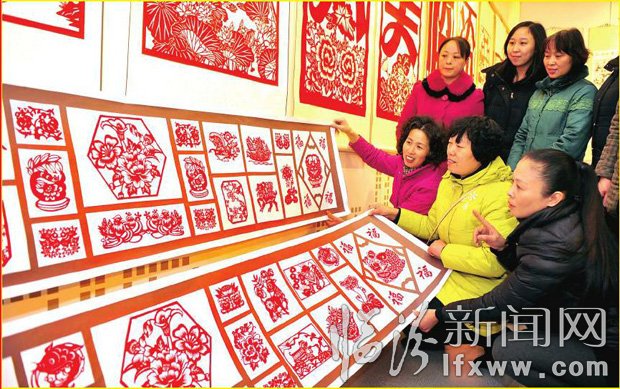 日前,在临汾规划展览馆,市剪纸协会的会员在布置剪纸展览。