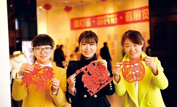 ②3月4日,在市规划展览馆“猜灯谜、赏民俗、看展览”元宵节主题活动现场,几名年轻人展示剪纸作品。 本报记者闫锐鹏李自强摄