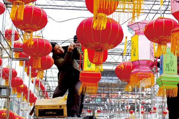 ③3月2日,吉县县城内工人正在搭建元宵节大型灯组。今年该县元宵节灯展主题为“三阳开泰,福满吉州”。 张保华摄