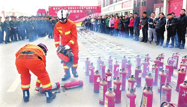 3月13日,我市举办“3·15”假冒伪劣消防产品销毁仪式,公开销毁500余件假冒伪劣灭火器、应急灯等不合格消防产品,并向现场人员讲解部分消防产品鉴别真假方法、辨别技巧等,引导大家进一步提高辨伪能力。图为市公安消防支队官兵在销毁不合格消防产品。