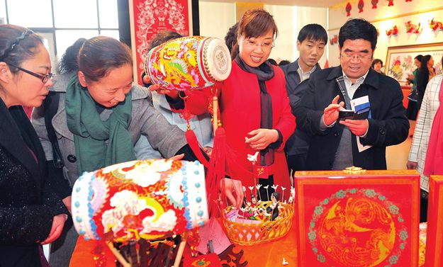 3月12日,在市规划展览馆,市民在妇女文化创意产业手工艺品交易展上了解产品工艺。当日,参加交易展的手工业企业44家,妇女手工艺产业协会111个,产品涉及手工编织、剪纸、刺绣布艺、花馍制作等50余个种类。