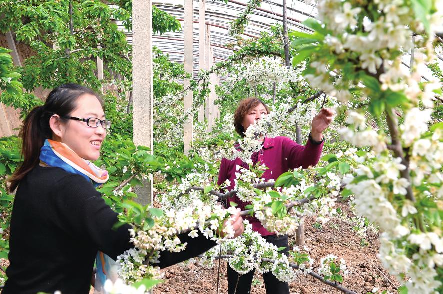 近年来,曲沃县下裴村村民王思英改变传统种植观念,投资30余万元,建起三个温室大棚种植樱桃,实现了传统农业向采摘观光旅游农业的转变。图为工作人员正在给果树进行摇花授粉作业。张荣 摄