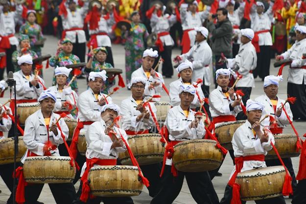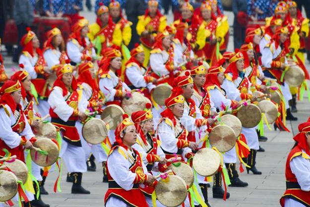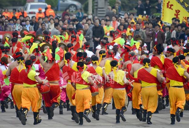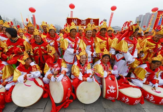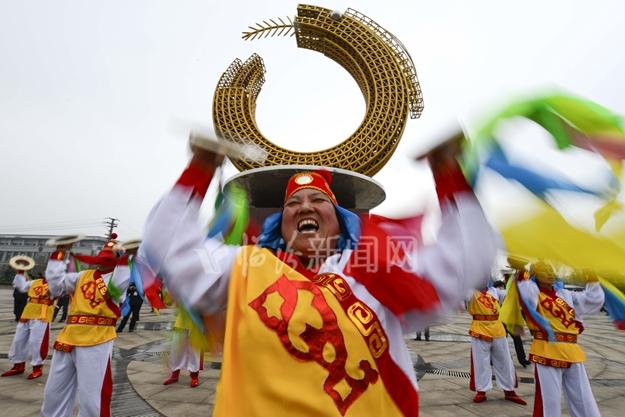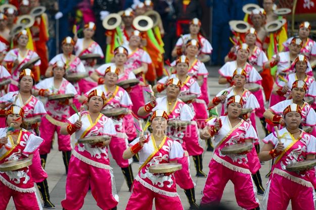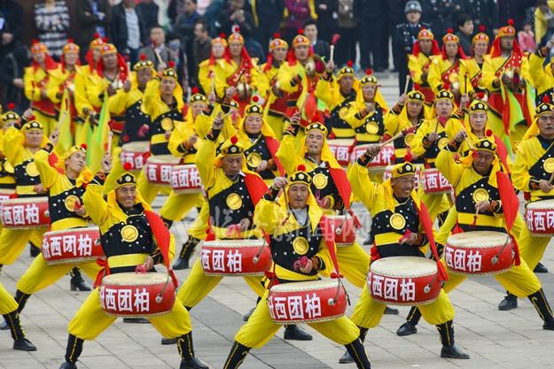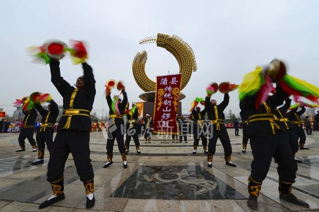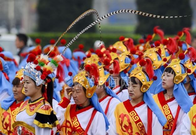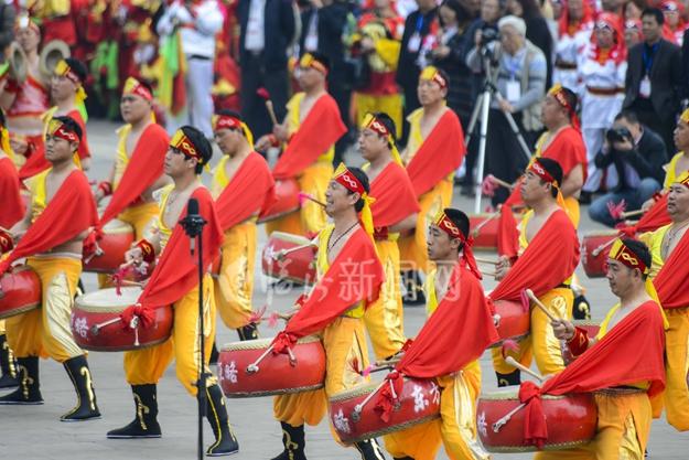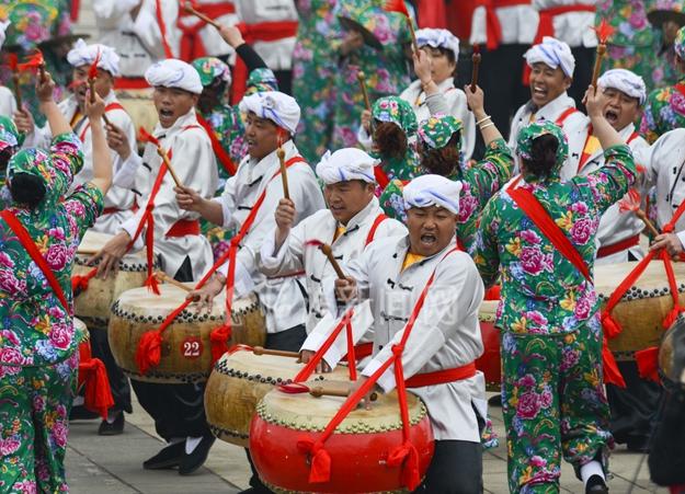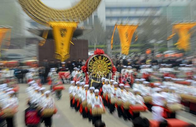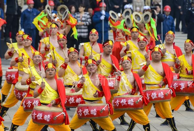 4月2日,“山西·临汾帝尧古都文化旅游节”十三项主题活动项目之一的锣鼓大赛在山西临汾襄汾县丁陶广场开赛,来自临汾市8个县市区的锣鼓队正在进行激烈角逐。