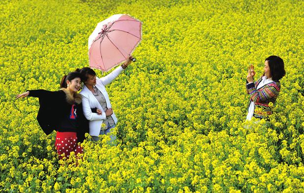 4月7日,在襄汾县丁村旅游风景区,满山遍野盛开的油菜花吸引了众多游人前来赏花留念。连日来,丁村旅游风景区油菜花香四溢,游客争相在花海中用镜头定格美丽的瞬间。记者 闫锐鹏 摄