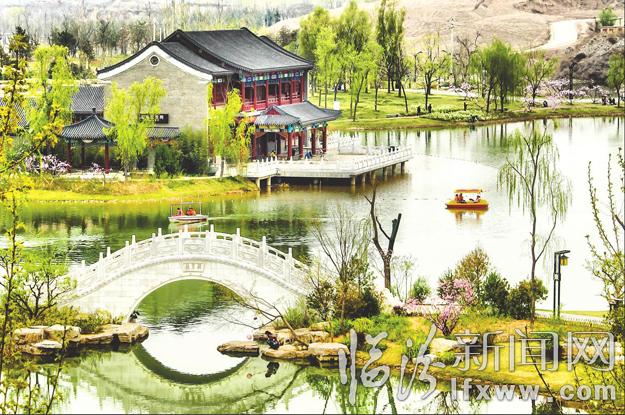4月21日,阳光明媚,涝洰河生态公园里绿树成阴,拱桥、楼榭与湖水交织成一幅“江南”美景。