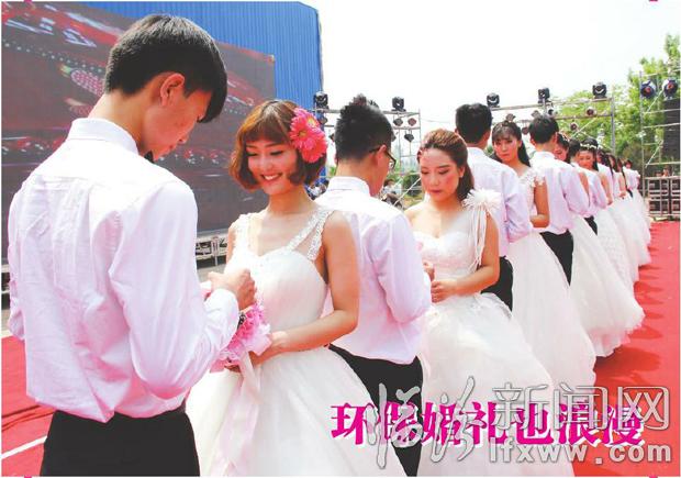 5月2日,一场以绿色、低碳、吾爱一生”为主题的集体婚礼,在曲沃县磨盘岭农业旅游观光区华丽绽放,共有10对新人经过求婚、牵手、拥抱、礼成等环节,步入了幸福的婚姻殿堂。现场有近千名群众观看了这一盛典。 张荣 摄