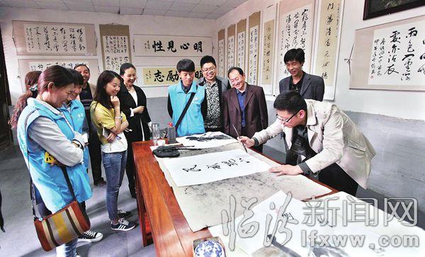 临汾新闻网讯 五月十九日, 在我市丁村民俗博物馆, 游客在“丁村文化交流平台”体验书画文化。 世界旅游日当天, 丁村民俗博物馆利用“丁村文化交流平台”以书画体验、 旧石器打制体验以及木版年画演示等互动环节进一步丰富景区文化项目以细致的服务为游客打造一个良好的旅游环境 记者 闫锐鹏 摄