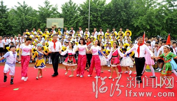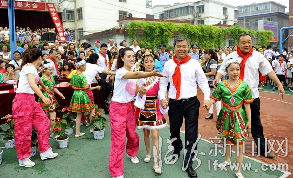 图为市领导在市第一小学和孩子们一起参加“六一”儿童节庆祝活动。