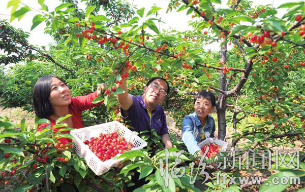 临汾新闻网讯近日,在翼城县南唐乡北唐村村民史安社家的樱桃园里,游客正在采摘樱桃。 史安社种植了2.5亩樱桃、120余株,今年喜获丰收。他顺应发展潮流,在自家樱桃园内设置了采摘服务区,让游客体验休闲采摘的乐趣,同时也增加了收入。 记者 李自强 摄