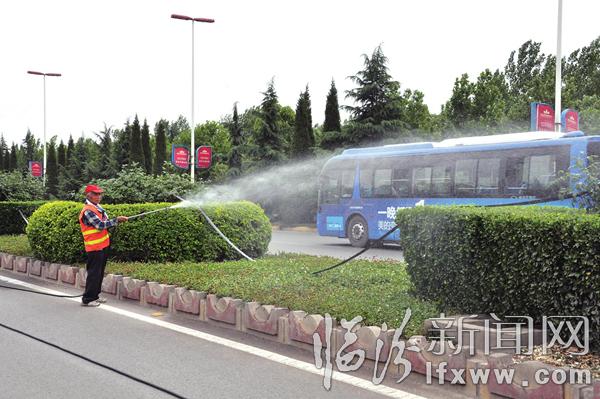 临汾新闻网讯 日前,市城市绿化二队的工作人员在为市区绿化带喷洒农药。