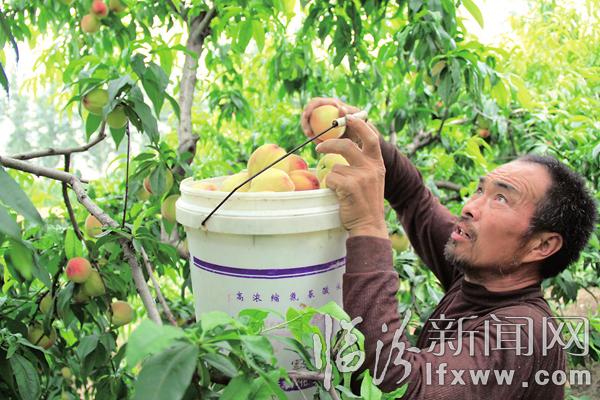 临汾新闻网讯 日前,在曲沃县北董乡西堡村桃农郭建广正在自家的两亩桃园里采摘桃子。近年来,该县科学调整农业种植结构,鼓励农民发展经济种植,引导农民依靠种植果树走上致富路。 张荣 摄