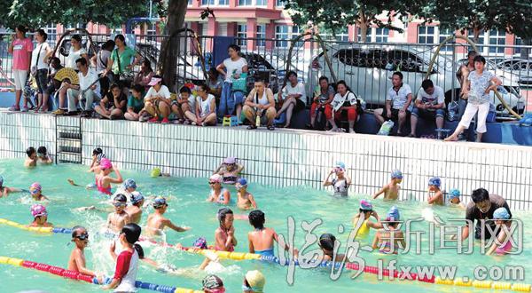 临汾新闻网讯 7月28日,家长陪护孩子在市第一小学游泳池戏水。连日来,我市高温天气不断,市区各大游泳池火爆异常,众多家长冒着酷暑陪着孩子学习游泳。