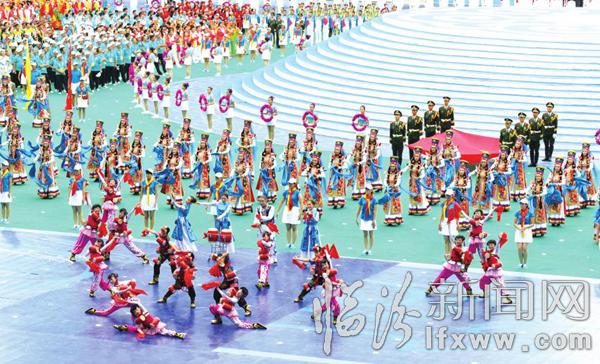 临汾新闻网讯 八月九日第十届全国少数民族传统体育运动会在内蒙古鄂尔多斯隆重开幕。 来自我市的少儿花鼓运动员代表山西省在开幕式上表演。记者 李虎威摄