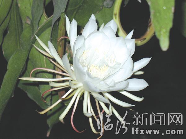 这株昙花高约180厘米,叶茂直径约200厘米,全株上下挂满了如小灯泡一样的花蕾。当日晚上8时许,昙花的花蕾慢慢地从中间翘起,形成了一个个花瓣。经过30多分钟后,直径大约15厘米、洁白如雪的花朵开放了,沁人心脾的花香顿时在空气中弥漫开来。