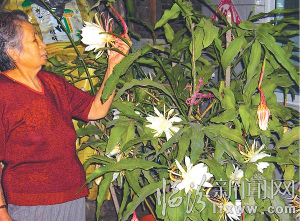 临汾新闻网讯 8月10日晚,在居住于尧都区五一路南二巷的王连根老人家中,一株十多年树龄的昙花竞相开出了30多朵雪白的花朵,记者有幸观赏了昙花开放的全过程。