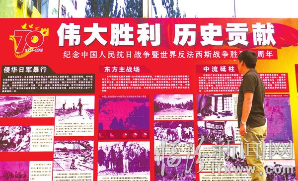“伟大胜利历史贡献”宣传展板的主要内容包括前言、中流砥柱、侵华日军暴行、东方主战场、伟大胜利、珍爱和平等几个版面。主要讲述了抗日战争史,侵华日军暴行,讴歌了中国人民奋起抗战的英雄事迹。“看了宣传展板的内容,让我受到了一次心灵的洗礼,深知今天的幸福生活来之不易。”市民武大钧感慨道。 记者 张蕴强 摄