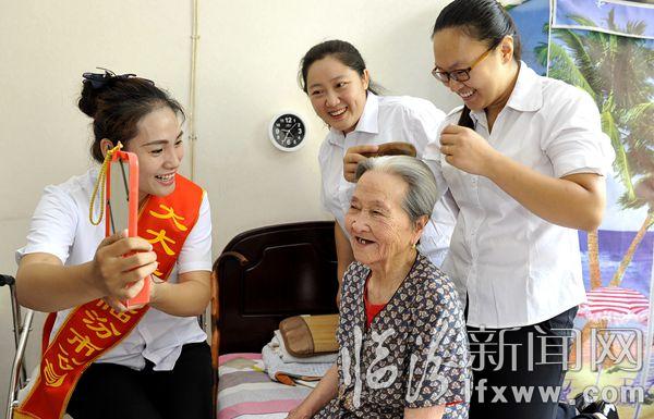 临汾新闻网讯 8月30日,在尧都区中心敬老院,青年志愿者在帮助老人梳头发。当日,大大集团临汾市公司开展了“夕阳最美,关爱老人”志愿者主题活动,10余名志愿者走进敬老院,和这里的老人结对子,开展了送慰问品、打扫卫生、象棋比赛等爱心活动,用实际行动弘扬尊老敬老的传统美德。闫锐鹏 摄
