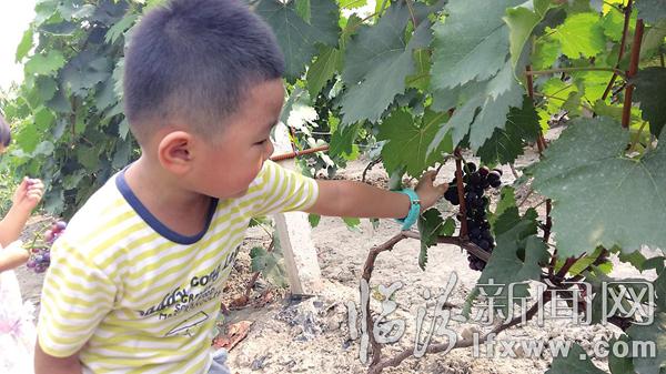 临汾新闻网讯 眼下正是吃葡萄的好时节,周末不少家长朋友带着孩子去葡萄基地采摘葡萄,一家人不仅能吃到新鲜的水果,还能享受亲子之乐。图为一位小朋友正伸手去摘他“看中”的一串葡萄。记者 白洁摄