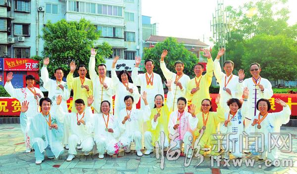 临汾新闻网讯 日前,在河南焦作举办的“第八届国际太极拳交流大赛”上,我市19名太极选手经过激烈的角逐,以扎实的功底和精彩的表演,共获得太极拳1枚金牌,6枚银牌,12枚铜牌;太极剑1枚金牌的好成绩,图为太极选手载誉归来。 记者 张君宇 摄
